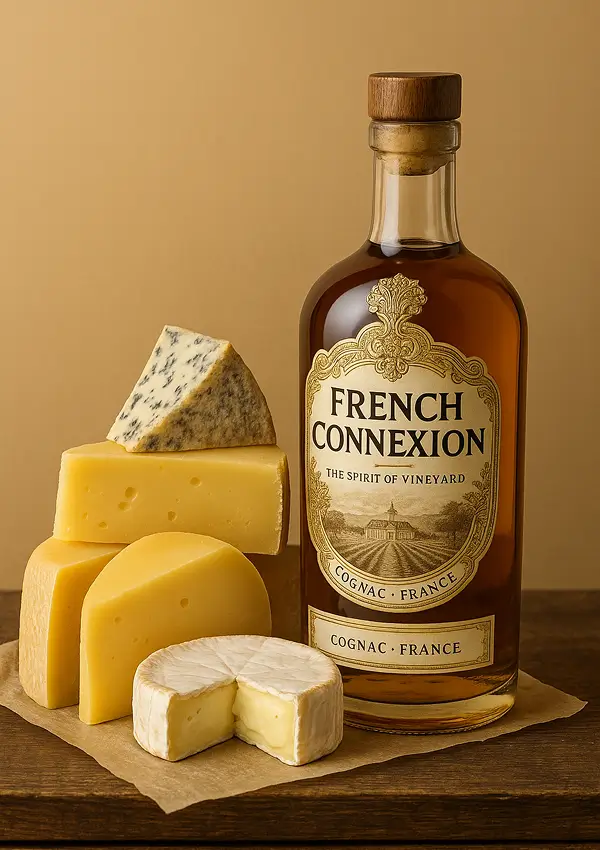 The pairing of French Connexion brandy with cheese creates harmonies that are as surprising as they are satisfying. Its rich, layered profile complements everything from smooth and creamy cheeses to firm, aged varieties. But it truly shines when paired with bold, intense cheeses like blue cheese4where its warm, spiced depth enhances and elevates the complexity of flavor.